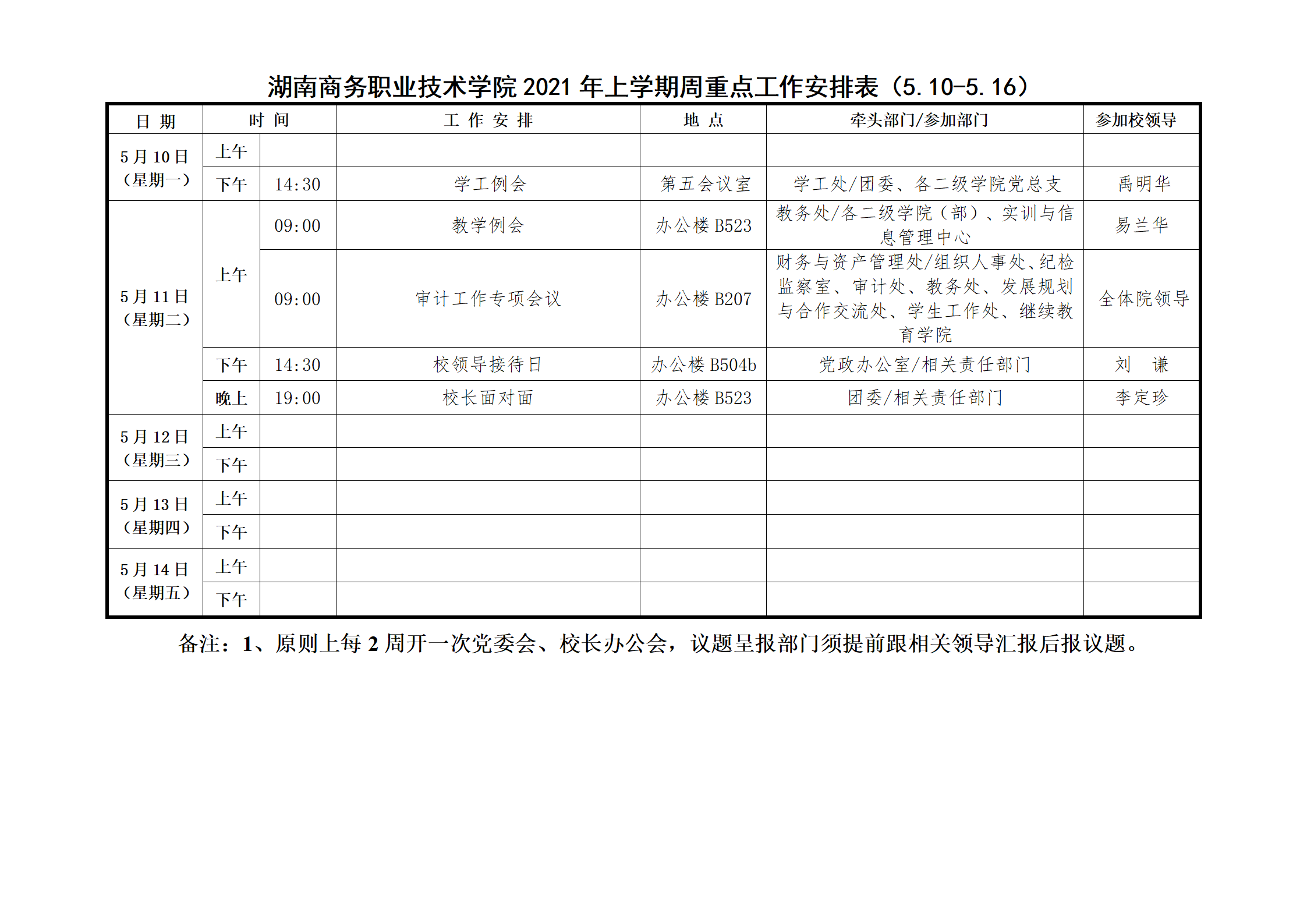 必威国际官网首页入口网站2021年上学期周重点工作安排表(5.10-5.16)