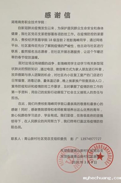 彭海峰同学所在的社区为了感谢他的所作所为特写了封感谢信,并致于崇高的敬意,相信我们终将战胜疫情。