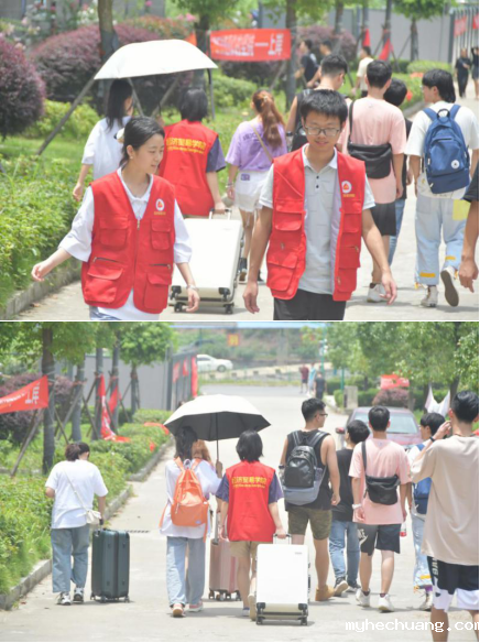 7月14日当天,考完试的志愿者们迅速穿好统一的服装,积极投入志愿服务工作当中。活动现场,志愿者们有序服务,分工协作。有的在宿舍楼梯间帮同学抗重物,有的为出宿舍门的同学打遮阳伞,有的为路上的同学提拉行李,有的为出校门的同学送上祝福。一个个汗流浃背的小红马甲被庞大的行李遮盖,一次次迈着稳重的步伐上下楼,温暖了每个归家学子的心。