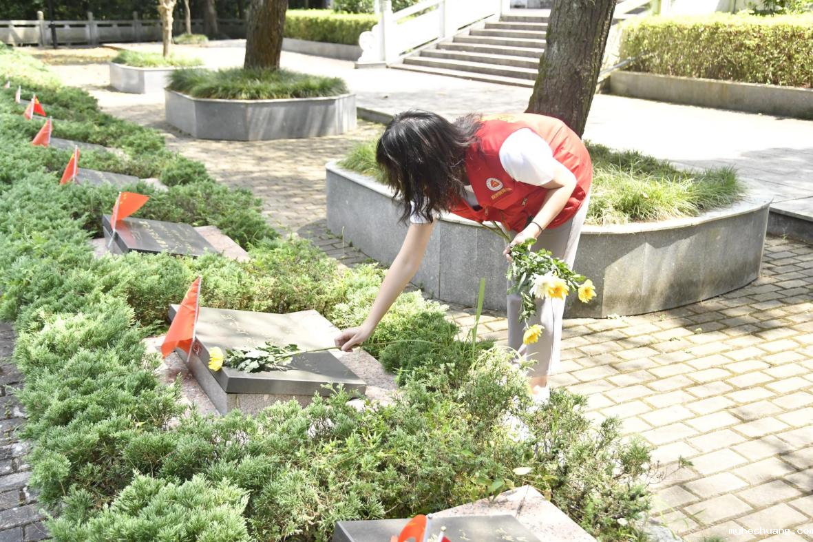 随后,志愿服务团的踏上了前往炎陵烈士陵园(原酃县烈士陵园)的红色之旅。志愿者们纷纷拿起手中的抹布走向烈士墓冢,认真细致的擦拭着烈士雕像和墓碑上的灰尘,并俯身将倾倒的小国旗整理好,使其高高飘扬在烈士墓碑的上方。清扫过后,志愿者们集体列队默哀,默默对革命先烈们说:“山河已无恙,人间皆安,如今的盛世中华如您所愿!”他们将一株株盛开的菊花轻轻地放在烈士墓碑旁,缅怀先烈,寄托哀思。一阵微风吹过大家的脸颊,仿佛在轻声的表达谢意。
