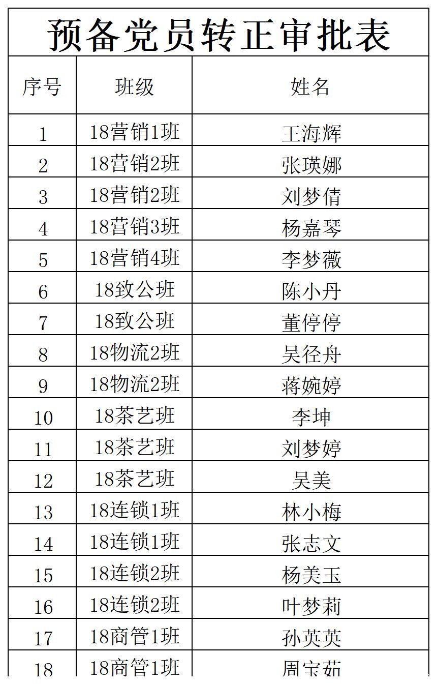 在听取党小组和党员、群众意见的基础上,经支部委员会审查,拟将王海辉等18名同志转为中共正式党员。报据发展党员工作有关要求, 现将其有关情况公示如下: