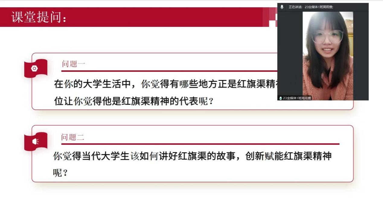 最后,主持人组织大家进行分享交流,23级市场营销(楚怡)2班白一茜谈论道:“通过今天的学习,我真切感受到红旗渠精神中蕴含的艰苦奋斗、团结协作力量之强大。林县人民在缺水的困境下齐心协力、迎难而上的精神值得我们永远学习。”23级全媒体广告策划与营销1班周雨萱也感悟道:“林县人民以这种精神,凭一锤一铲一双手,在悬崖峭壁上建成了‘人工天河’。作为新时代青年,我们应传承此精神,为民族复兴贡献青春力量。”