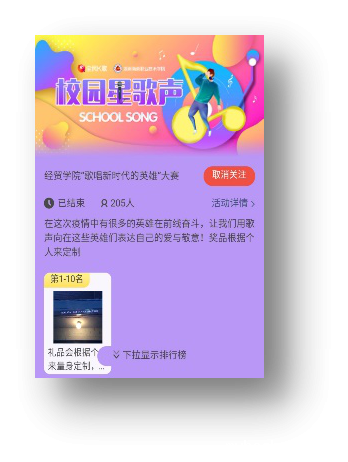 经过14天的激烈角逐,19物流2班刘芊宇歌唱的《只要平凡》、19市营1班赵诗玮的《即刻出发》和19市营1班何正芬的《挥着翅膀的女孩》在众多参赛作品中脱颖而出,位列前三。同时,荣获前十名的选手名单也火热出炉,共同获得大赛为他们量身定制的精美奖品。
