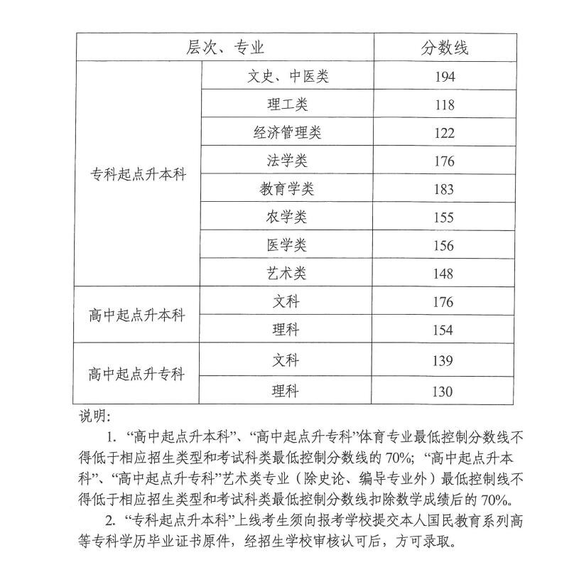 湖南省2018年成人高校招生考试成绩及录取控制分数线