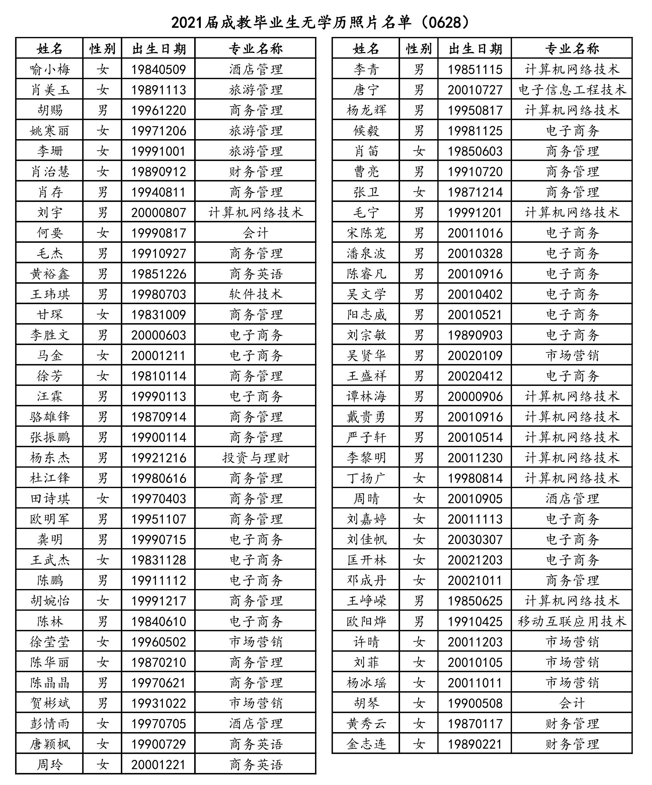 根据教育厅文件以及我院6月3日印发的《关于进一步做好我院2021届成人高等教育毕业生学历证书电子注册的通知》要求,截止到6月28日上午8点30分,我院2021届成教毕业生(2019级学生)还有5人身份核验不确定、71人未上传学历照片,名单附后。