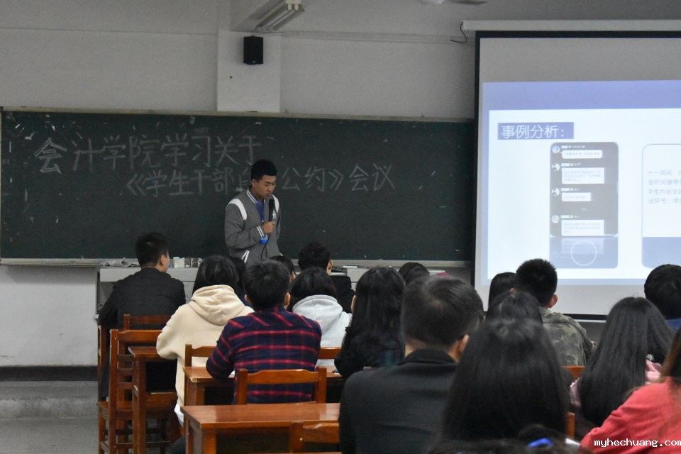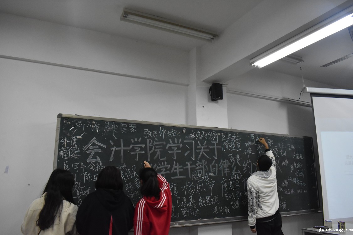 会议开始前,由纪检部进行会议点到。紧接着主持人开场白,宣布活动开始。学习学生会干自律公约,针对于学校功利化、庸俗化的现象进行讨论并通过PPT展示现象;针对于讨论出来的现象以及PPT展现出来的问题,提出解决办法,制定相应的制度;接着在会计学院主席唐悦带领第十五届团学分会全体学生会干部进行公约集体宣誓;最后全体学生会干部参与倡议签字仪式。