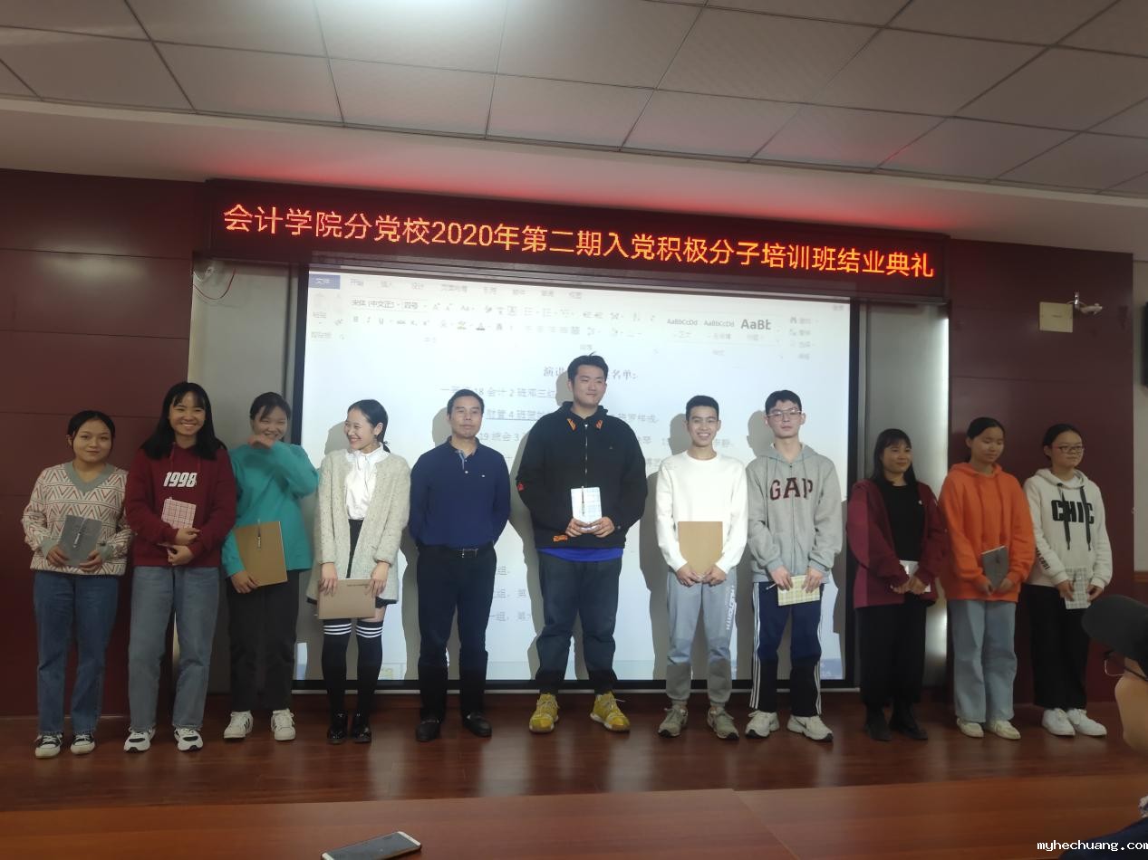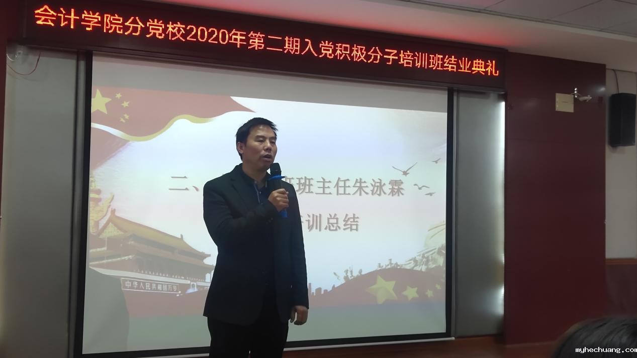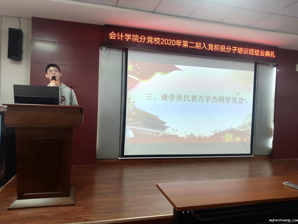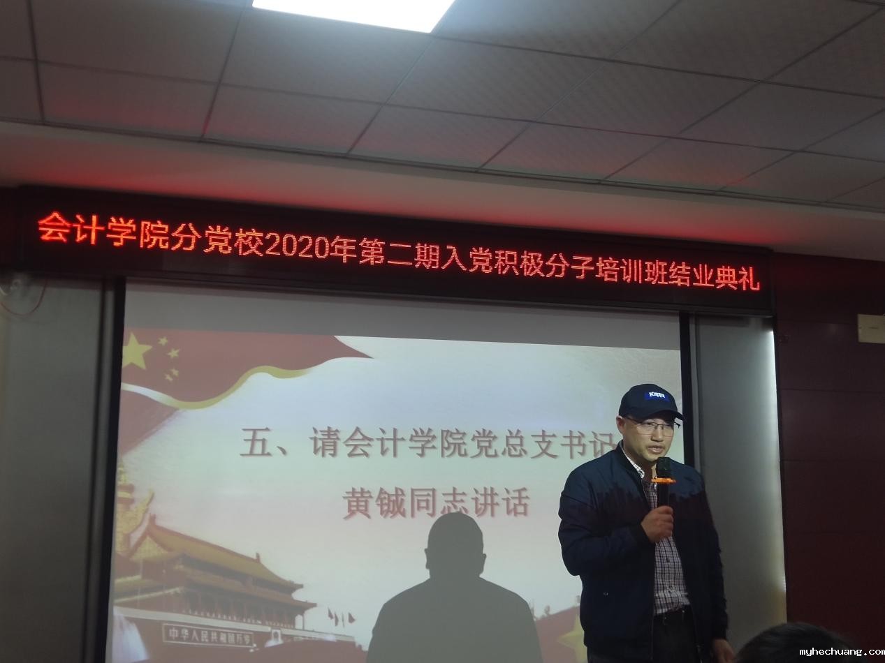 黄铖同志说到:在这金秋10月这丰收的季节,同志们成为入党积极分子培训班结业的学员,是优秀的学员、是优秀的大学生。当然,优秀的大学生,需要在思想上积极要求上进,在行动上践行我们积极上进的思想。无论是在学习中,在生活中,还是在工作中,都应当要从思想上和行动上真正向党组织靠拢。最后黄铖同志祝贺大家顺利结业,并期待大家成为优秀的财务管理专家。