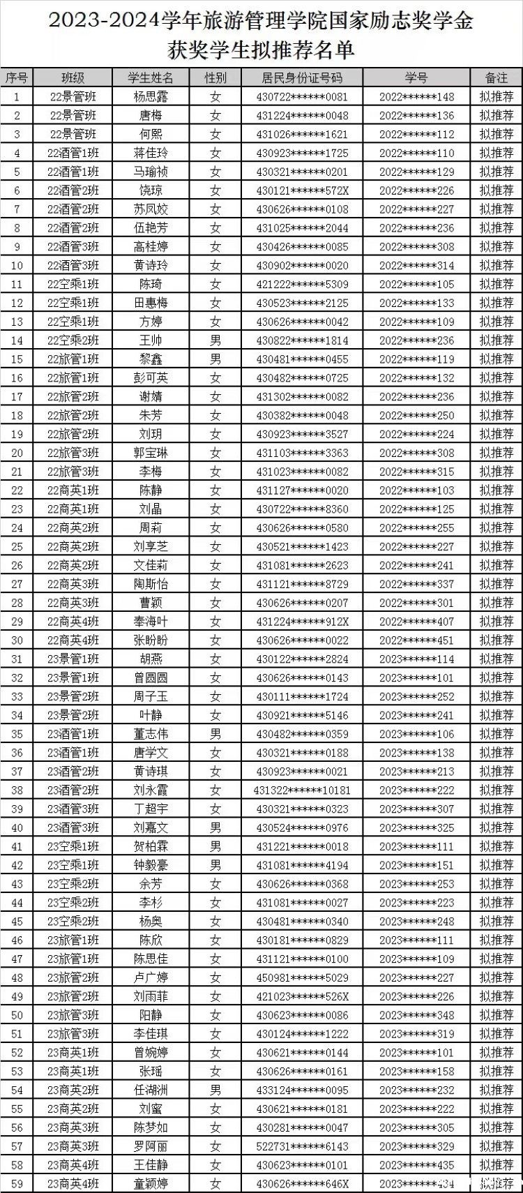 关于旅游管理学院2023-2024学年 国家励志奖学金评选结果的公示
