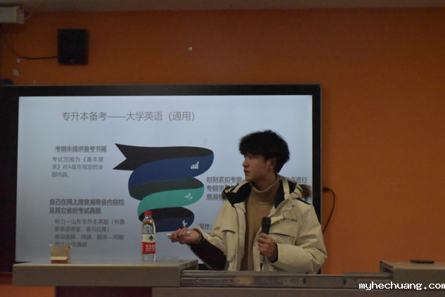 虞昌,现为湖南工商大学外国语学院专业的学生,他以“用最努力的心,做到不负韶华”为主题为商英专业的同学们讲解了一些班级管理方法、学习考证计划及专升本的相关经验。结合亲身经历,他鼓励学弟学妹们在学习和生活上要勇于挑战自我,并尽可能的实现自身的最大价值。