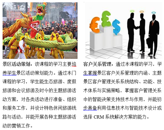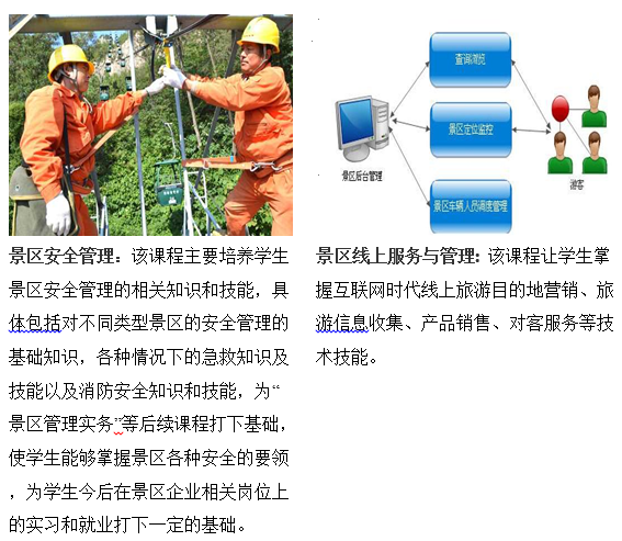 本专业方向主要面向旅游景区、旅游规划公司、旅游行政管理部门,培养具有良好的职业道德和职业素养,掌握旅游景区运营与管理专业基本知识和职业核心能力、熟知岗位职业流程、具备基层管理经验的,具有可持续发展能力的高素质、高技能型基层旅游景区管理人才。