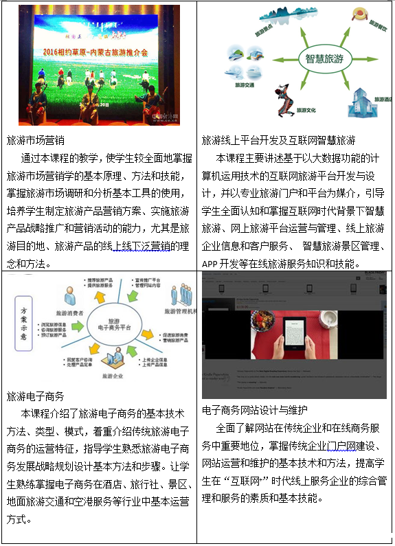 线上旅游运营与管理方向主要面向旅游电子商务企业与平台、传统旅游企业线上运营与营销、智慧旅游景区与企业管理与运营、旅游产品线上推广和销售,定制式旅游活动和产品的设计与销售,线上旅游平台设计与管理等,培养具有旅游电子商务服务、旅游信息管理与服务、旅游网络营销、线上旅游产品定制式设计及服务,旅游活动策划等基本知识和运营技能,能胜任线上旅游平台开发与设计、线上旅游平台运营与管理、旅游网络营销、线上产品设计与服务、定制旅游产品设计及服务、旅游销售顾问、旅游销售主管、电子商务客户服务、网站维护与网页制作等工作岗位,具有良好的“互联网+”综合职业素养的现代高素质、硬技术、高技能型一流的线上旅游服务和管理人才。