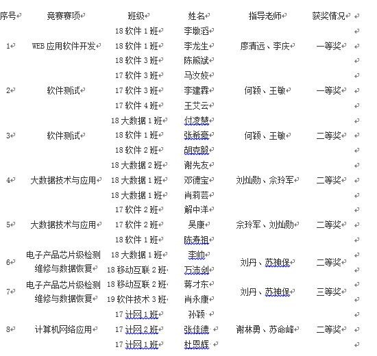 在2020年湖南省职业院校技能竞赛中,由我院40名参赛学生、12名指导老师组成的14支参赛队伍参加了“软件测试”、“Web应用软件开发”、“大数据技术与应用”、“计算机网络应用”、“电子产品芯片级检测维修与数据恢复”、“移动互联网应用软件开发”、“云计算技术与应用”等7个赛项的比赛。在紧张激烈的角逐中,指导老师凭借扎实的专业素养、丰富的带赛经验、精进的敬业精神,参赛选手凭借过硬的基本功、顽强的拼搏精神、稳定的心理素质,最终在众多参赛队伍中脱颖而出,共荣获一等奖2项、二等奖5项、三等奖6项。