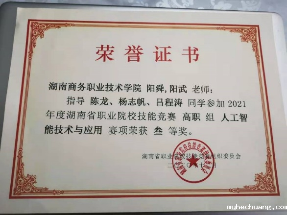 2020年的湖南省职业院校技能大赛“人工智能技术与应用”赛项中,我校选手陈龙、杨志帆、吕程涛同学在阳舜、阳武二位老师的指导下获得三等奖。2021年的“湖南省人工智能训练师”赛项中,我校选手肖佳豪、詹敦厚、李宇明、刘乔同学在许苗华、阳舜二位老师的指导下分获得二、三等奖。