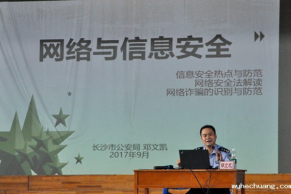 9月18日下午,学院特邀长沙市公安局网技支队网络管理科副科长、一级警司邓文凯,在学院体育馆为3000余名师生举办了《网络与信息安全》的专题讲座,讲座由学工处处长唐柳荷主持。