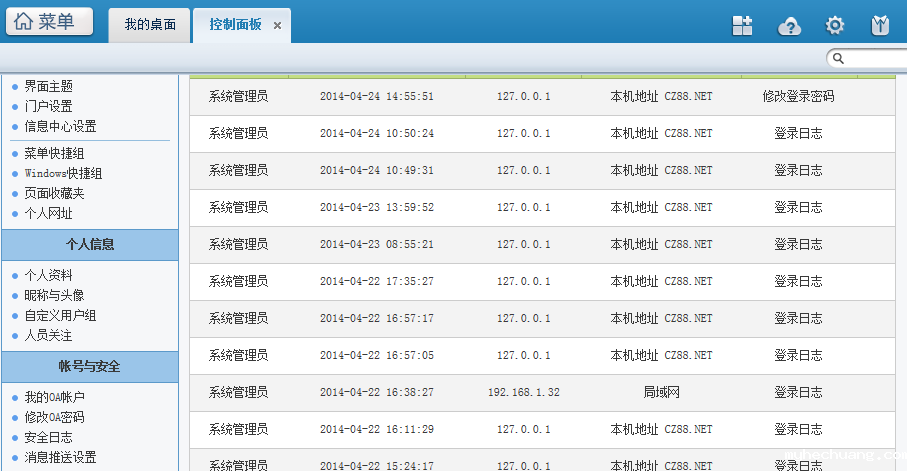 14)安全日志:记录自己登录OA系统的相关信息,如时间、IP等信息,如图所示: