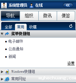 5)Windows快捷组:“Windows快捷组”类似浏览器的收藏的快捷方式,windows快捷组首先在“控制面板”中设置好,然后在windows分类中点击“通达官网”,浏览器就会打开通达官方网站,如果是第一次使用此功能,那么,浏览器需要加载一个插件(通达OA windows快捷组),此功能目前只在经典主题显示(具体效果见结尾处),梦幻灵动主题不显示,如图所示: