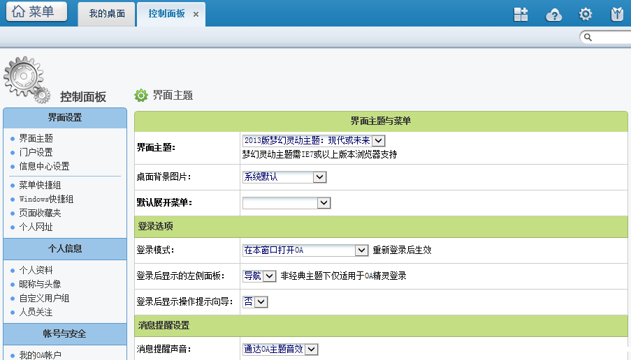 1)点开“控制面板”默认进去的是控制面板->界面主题页面,在这里可以自定义主题、背景图片等,其中“消息提醒窗口弹出方式”只会在经典主题下显示,梦幻灵动主题主题不显示,如图所示: