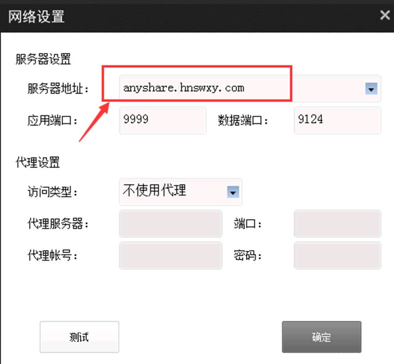 (6)如果你在“(4)”步中勾选了第4项“安装完成后启动 爱数AnyShare”,那么你将会看到如下图所示的窗口。如果没看到如下图所示的窗口,请到你的电脑桌面上找到“爱数AnyShare 5.0”的应用程序图标,双击打开后也能看到如下图所示的窗口。在“服务器地址:”栏内填上“anyshare.hnswxy.com”,其他参数不能改。单击“确定”