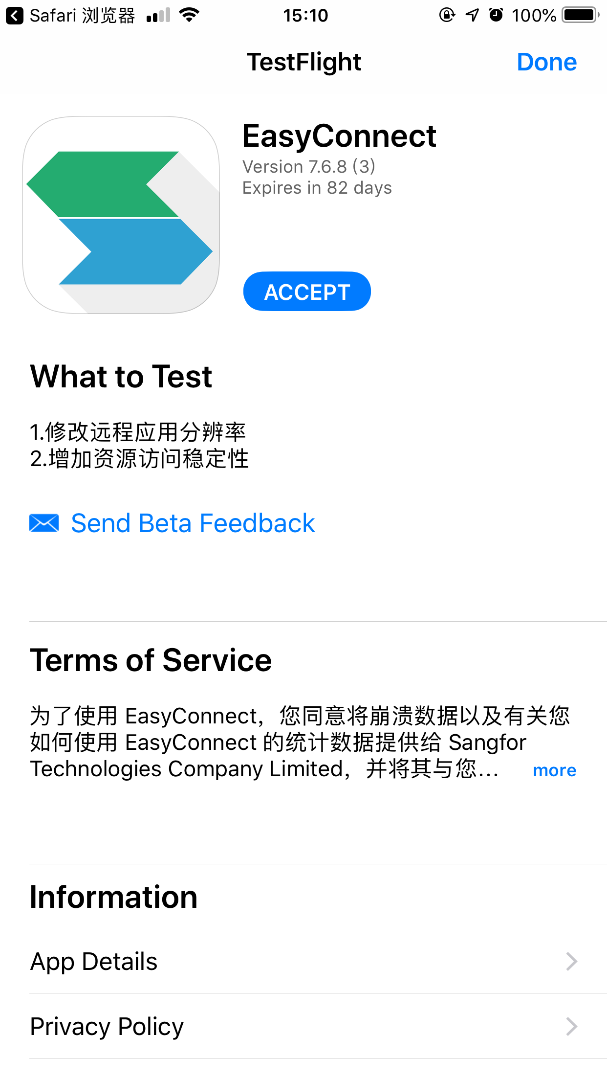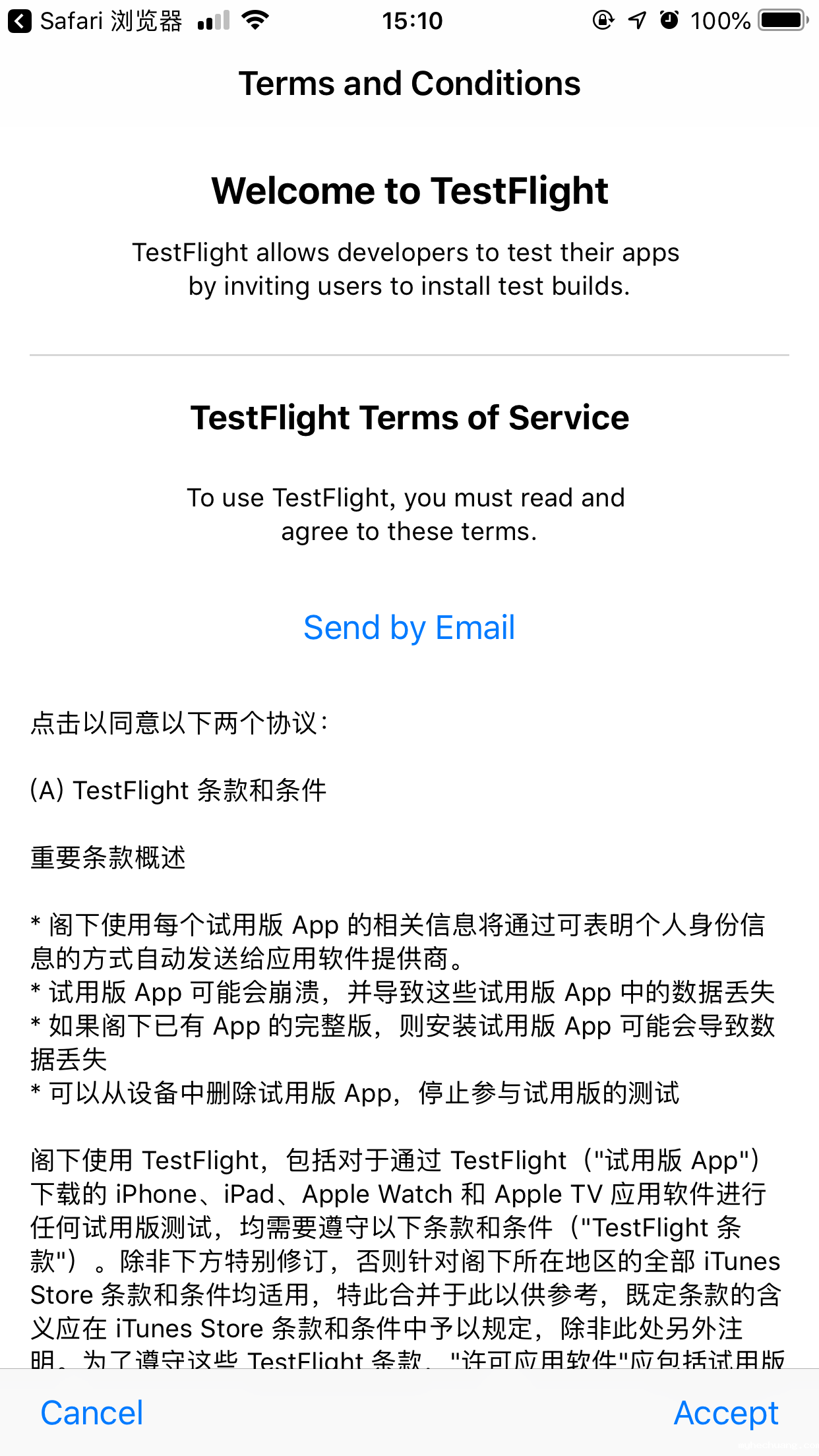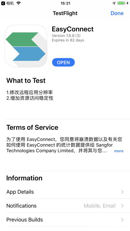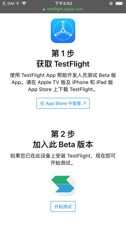 5. 安装testflight完成之后,再回到safari,进行第2步,点击开始测试,会跳到testflight中去: