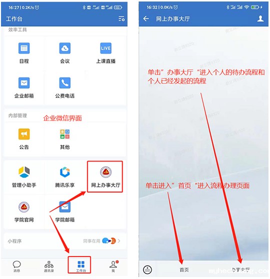 第一步:打开企业微信(请下载企业微信),按下图所示进入网上办事大厅。