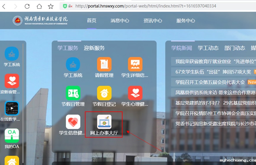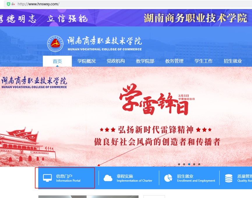 第一步:进入学校官网,点击“信息门户”,在左侧框中点击“网上办事大厅”,或者直接在浏览器地址栏中输入:http://portal.hnswxy.com