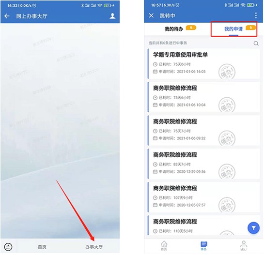 第三步:点“提交办理”后,可以通过“办事大厅”->“我的申请”来查阅之前发起过的流程的审批情况