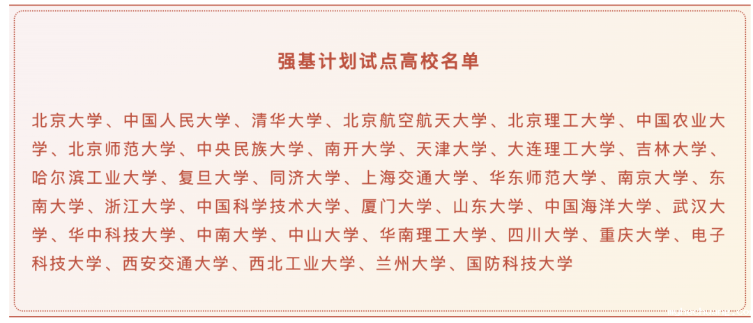 而强基计划更着眼于国家基础学科的人才培养,不仅涉及“入口”通道,还有长期培养。因此,强基计划首先限定了招生的基础学科,即数、理、化、生物、计算机、以及文(语言文字,不是文学)、史、哲等;入学后也不能自由转换专业。打个比方,你若是因物理竞赛特长被招进来的,就只能学物理,不能转学金融、经济等等,未来也不可以转换专业。