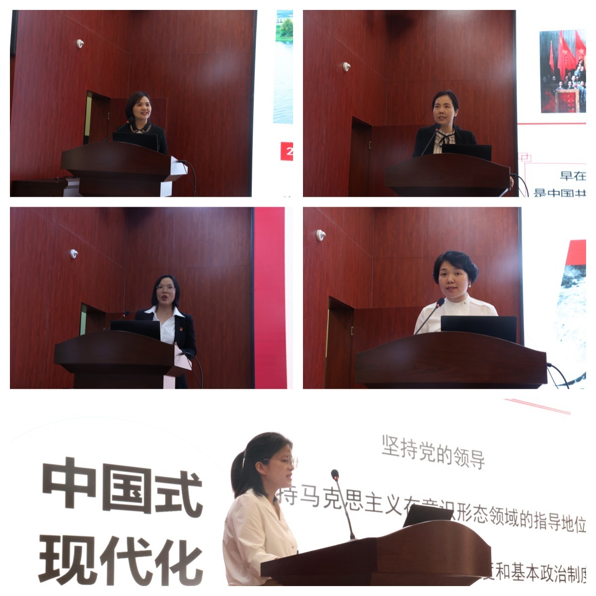 马克思主义学院孔霞老师以《以中国式现代化全面推进中华民族伟大复兴》为题、王智慧老师以《畅通社情民意交汇点 实践全过程人民民主》为题、乔颍老师以《如何理解全面依法治国是国家治理的一场深刻革命》为题、汤艺峰老师以《凝心铸师魂 立德育新人》为题、付译文老师以《使命如磐 贡献青春力量》为题先后进行了微宣讲。她们围绕党的二十大精神,讲理想、话初心、谈体会、述心得,声情并茂、娓娓动人。或从中国式现代化建设的伟大实践入手,阐释美丽中国建设的重大意义;或从身边的普通人、平凡事入手,分享国泰民安的温暖点滴;或从立德树人的耕耘收获入手,展示科教兴国战略的壮阔前景。