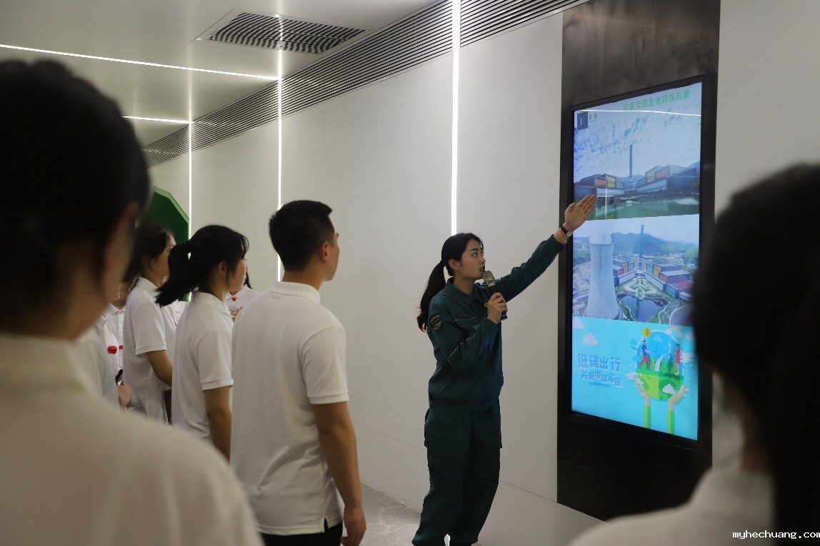 行程路上可见冷却塔、烟囱、垃圾储坑、焚烧发电长房等建筑鳞次栉比,沿着参观通道进入处理车间,映入学生眼帘的是一块大型电子屏,上面正实时显示各项环境监测指数,现场的数字化设备和电子器件把在场学生弄得眼花缭乱。