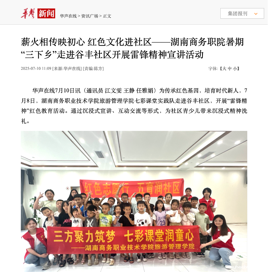 华声在线报道——薪火相传映初心 红色文化进社区——湖南商务职院暑期“三下乡”走进谷丰社区开展雷锋精神宣讲活动
