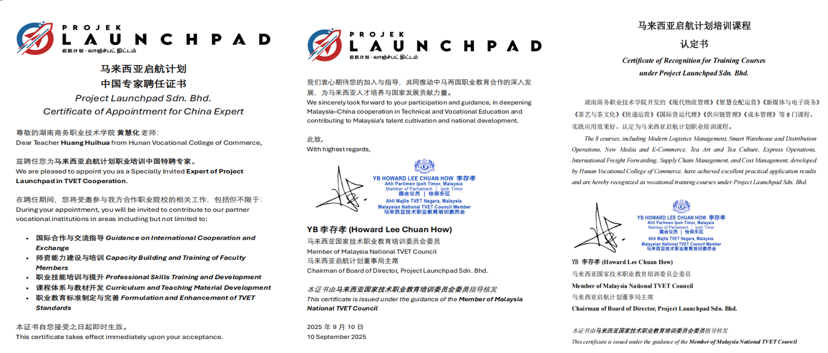 近日,经济贸易学院在国际职业教育合作领域取得重大突破,陈学忠、黄慧化、禹海慧、辛磊、成莹洁、朱波、李园、彭庆、卢宇、毛斑斑、钱秋兰等11位教师正式被马来西亚国家技术职业教育培训委员会(Member of Malaysia National TVET Council)认定为“马来西亚启航计划职业培训中国专家”。这11位教师均在各自专业领域拥有丰富的教学和实践经验,他们将作为中国职业教育的代表,为马来西亚“启航计划”提供专业的培训、咨询与指导。同时,学院开发的《现代物流管理》《智慧仓配运营》《新媒体与电子商务》《茶艺与茶文化》《快递运营》《国际货运代理》《供应链管理》《成本管理》等8门优质课程也同期获得该委员会认证,纳入马来西亚“启航计划”职业培训体系,直接服务于马来西亚技术技能人才的培养,助力其产业升级和经济发展。