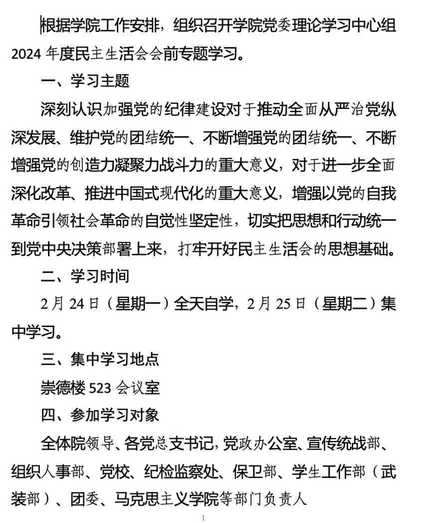 关于开展学院党委理论学习中心组2024年度党员领导干部民主生活会集中学习研讨的通知