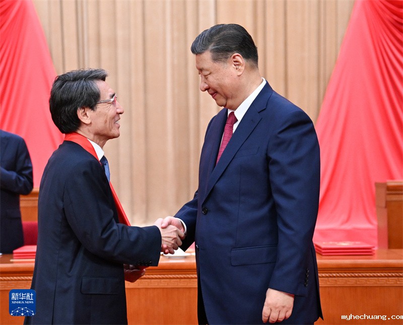6月24日,全国科技大会、国家科学技术奖励大会和中国科学院第二十一次院士大会、中国工程院第十七次院士大会在北京人民大会堂隆重召开。中共中央总书记、国家主席、中央军委主席习近平向获得2023年度国家最高科学技术奖的清华大学薛其坤院士颁奖。(新华社记者 谢环驰/摄)
