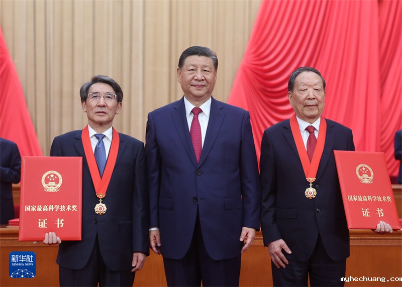 6月24日,全国科技大会、国家科学技术奖励大会和中国科学院第二十一次院士大会、中国工程院第十七次院士大会在北京人民大会堂隆重召开。中共中央总书记、国家主席、中央军委主席习近平向获得2023年度国家最高科学技术奖的武汉大学李德仁院士(右)和清华大学薛其坤院士(左)颁奖。(新华社记者 鞠鹏/摄)