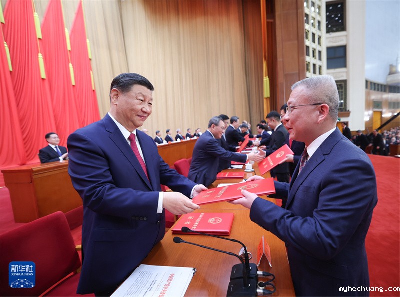 6月24日,全国科技大会、国家科学技术奖励大会和中国科学院第二十一次院士大会、中国工程院第十七次院士大会在北京人民大会堂隆重召开。中共中央总书记、国家主席、中央军委主席习近平向获得2023年度国家最高科学技术奖的清华大学薛其坤院士颁奖。(新华社记者 鞠鹏/摄)