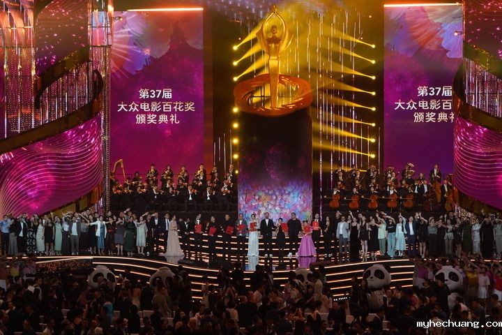 2024年8月4日,在四川成都,第37届大众电影百花奖获奖者和大众评审在舞台上合影。(新华社记者 唐文豪/摄)