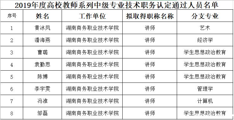 根据省教育厅职改办通知精神,我院2019年度高校教师系列中级专业技术职务认定工作已经结束,黄冰凤、潘海燕、曹璐、袁勤思、陈博、李宇雯、冯准、邹磊共8位同志通过了认定,现予以公示。如有不同意见,请于2019年12月25日至12月31日内向组织人事处或纪检监审处反映。
